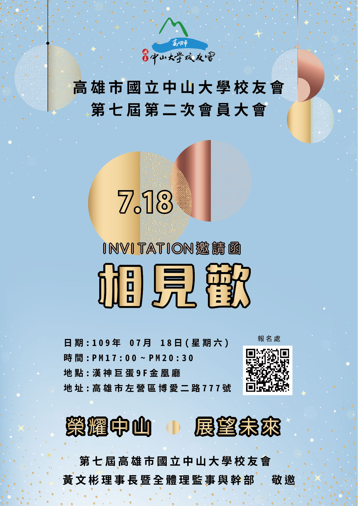 親愛的校友們,感謝校友您長期對高雄市國立中山大學校友會的支持與鼓勵。 第七屆第二次會員大會即將召開,當天將進行年度會務成果以及下半年活動規畫報告,會後聯誼晚會備有精緻餐飲,知名樂團演奏,以及歡樂賓果摸彩遊戲。