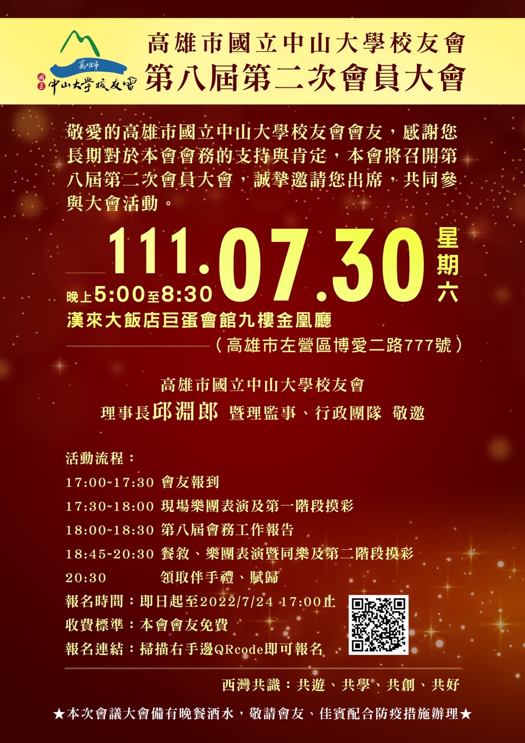 敬愛的高雄市國立中山大學校友會會友,感謝您長期對於本會會務的支持與肯定,本會將召開第八屆第二次會員大會,誠摯邀請您出席,共同參與大會活動。
